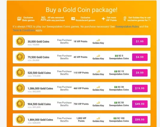 | Description | $9.99 - 200,000 GC + 20 free SC + 110 VIP Points + Golden Key $19.99 - 400,000 GC + 40 free SC + 460 VIP Points + Golden Key |