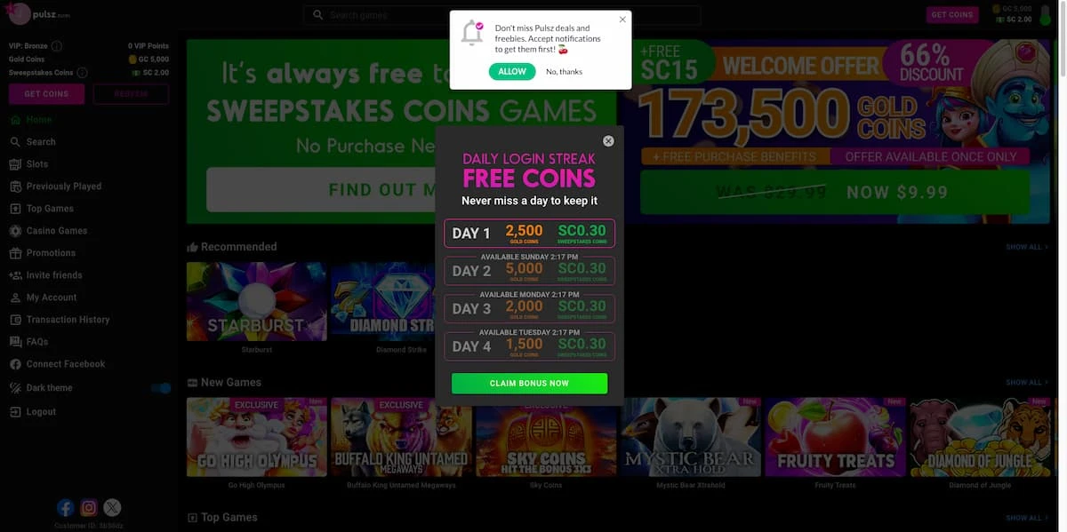 I received 5,000 GC and 2 free SC right after creating a new account and entering the bonus code SSCPULSZ. The first daily bonus of 2,500 GC + 0.3 SC was also available right away. After I opted into their welcome bonus, I was prompted to accept my first daily bonus package by clicking “Claim.”