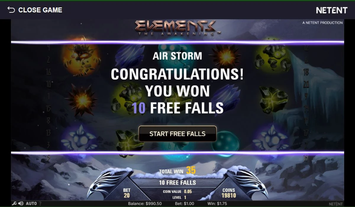 The bonus round offers players 10 free falls (aka free spins). The element you’re assigned also determines the Wild Symbol’s special functions. When I triggered the bonus round, I won Air Storm. In this version, the Air “blows” two Wild Symbols around the board on every spin, to mix up my chances of winning.
